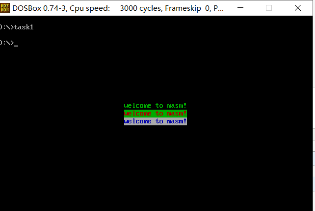 编程:在屏幕中间分别显示绿色、绿底红色、白底蓝色的字符串“welcome to masm!”。