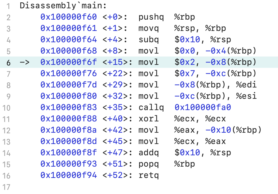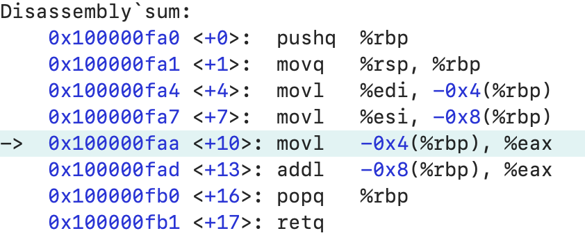 - 可以看出sum函数入口地址0x100000fa0,在主函数中使用callq调用。