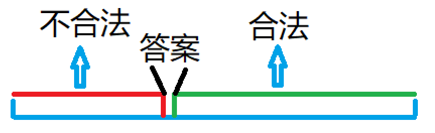 最优化问题的"值域"往往具有特殊的单调性——两段性, 即一段合法而另一段不合法, 借助二分, 我们可以找到两段区间的端点, 即答案