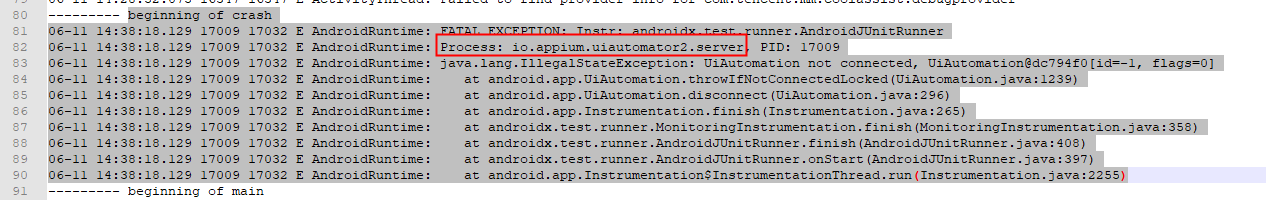 最近在跑appiun自动化,发现跑了一段时间后很稳定,经常中断,报:Original error:Could not proxy command to remote server. Original error:socket hang up,网上各种方法试过了,重新卸载软件,appium setting,重启设备,都不行,后来检查logcat日志,发现报错