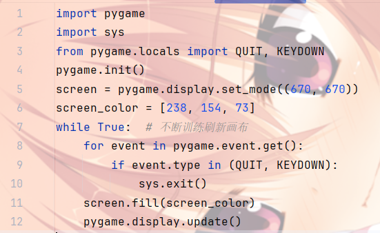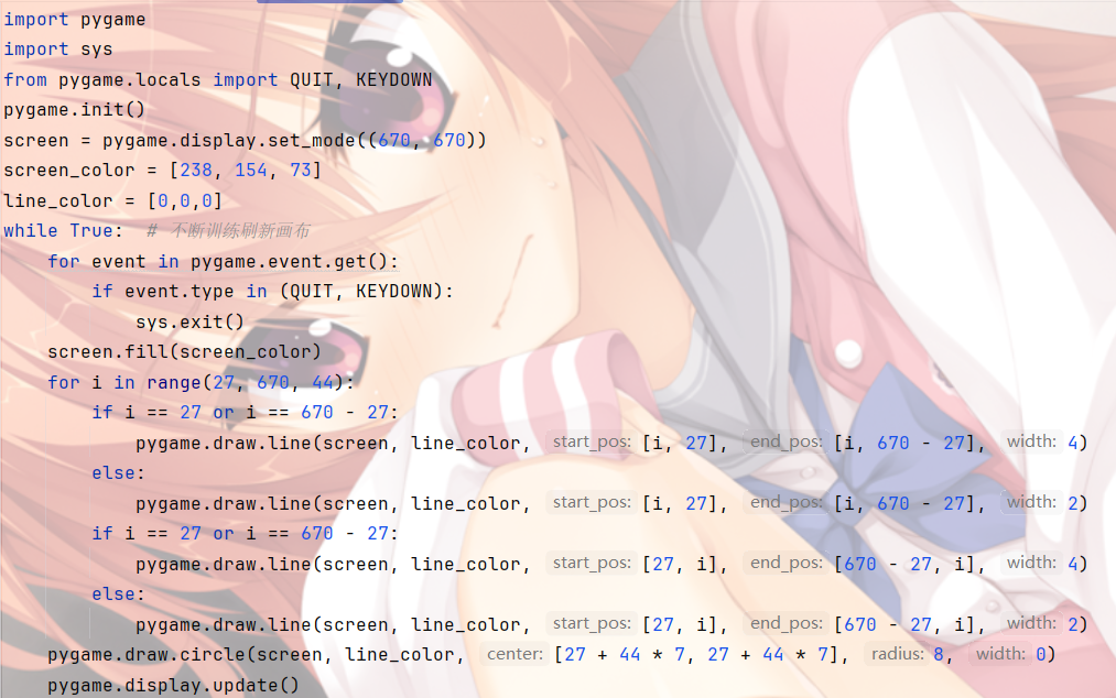 运用import导入pygame、sys模块,sys模块用于提供接口,用于访问python解释器自身使用和维护的变量,同时模块中还提供部分函数,可以与解释器进行交互。之后我初始化pygame,获取对显示系统的访问,并创建一个窗口,我将窗口设置为670×670,又设置了画布的颜色为(238,154,73)。但是,这样的话,程序一经运行便会关闭,因此,有必要对其进行训练刷新画布,此时,我运用了while循环函数以及if函数,当按键或者关闭窗口时,程序会退出。之后会清屏以及刷新显示。