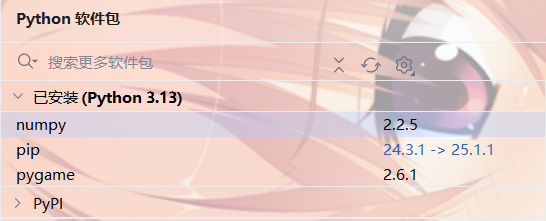 由于该程序需要使用pygame以及numpy插件,所以首先要在python中安装这两个插件。如图所示,在python软件包中搜索,之后便可以安装。其中,pygame是一个用于编写游戏的python模块集合,它允许开发者使用python编写具有完整功能的游戏和多媒体软件。numpy则是python中基于数组对象的科学计算库,支持大量的维度数组与矩阵运算。