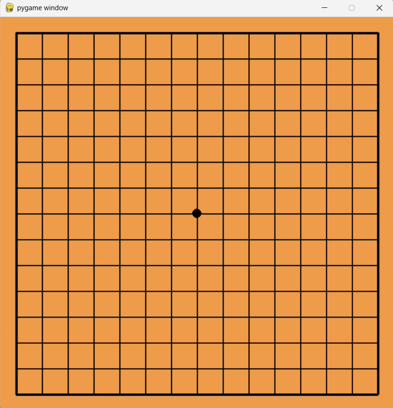 初步的画布已经完成,接下来需要绘制网格线,这需要用到函数对其颜色、长度等进行定义,line_color表示线条颜色,[0,0]表示起始位置,[670,670]表示终止位置,2表示线条粗细。五子棋一般棋盘大小为15x15,而初始化的窗口大小为670x670,出于美观的需要,每个棋子之间需要存在一定的间隔。于是我定义每个棋子的半径大小为20,每颗棋子间隔为2,相邻的两条横线或者竖线之间间隔为44,最边缘的两条线和棋盘边缘距离为27。我利用if函数开始画15条棋盘的线,从27开始,循环间隔为44。为此,我用了for循环,变量i从27开始,到670之前结束,每次循环增加44,同时,如果i等于27或者等于670-27(即绘制最左边和最右边的边框),线条的粗细为4像素,否则,线条的粗细为2像素。此外,我还在棋盘中心的位置作一个标记,即一个黑色的实心小圆。pygame.draw.circle(screen, line_color,[27+447,27+447], 8,0),[27+447,27+447]为圆心位置,即棋盘正中心,8为圆的半径大小,0表示实心圆,如果设置为1则输出空心圆。