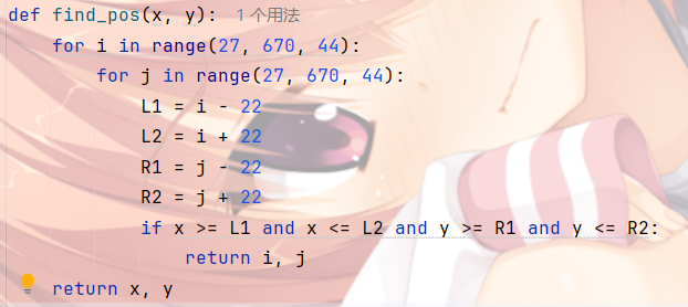 现在需要根据鼠标信息落子,即点击鼠标左键落子,为了美化效果,应当实时获取鼠标的位置信息,显示出当前落子的位置。即代码x,y = pygame.mouse.get_pos(),获取鼠标坐标信息之后,需要找到这个坐标具体落入的位置,因此需要进行判断:首先循环遍历棋盘的格子中心点,之后判断输入点是否在当前格子范围内,其中,L1=i-22和L2=i+22定义当前格子在水平方向上的边界,而R1=j-22和R2=j+22则定义当前格子在垂直方向上的边界,if x>=L1and x<= L2 and y>=R1 and y<=R2表示如果输入的点 (x, y) 落在当前格子的范围内,则认为该点属于这个格子,最后返回结果,如果找到符合条件的格子,则返回格子的中心点坐标 (i, j),表示为“可以落子的位置”,如果没有找到符合条件的格子,则返回原始输入坐标 (x, y)。