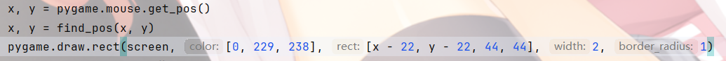 返回可以落子的位置后,需要将其显示,我选择使用一个正方形框出来,正方形框的代码为pygame.draw.rect(screen,[0 ,229 ,238 ],[x-22,y-22,44,44],2,1),同画圆的函数基本一样。[0 ,229 ,238 ]是颜色的RGB,[x-22,y-22,44,44]表示从位置(x-22,y-22)开始向右向下分别延长44的长度,得到一个正方形,2表示线条的粗细程度,1表示空心的正方形。