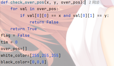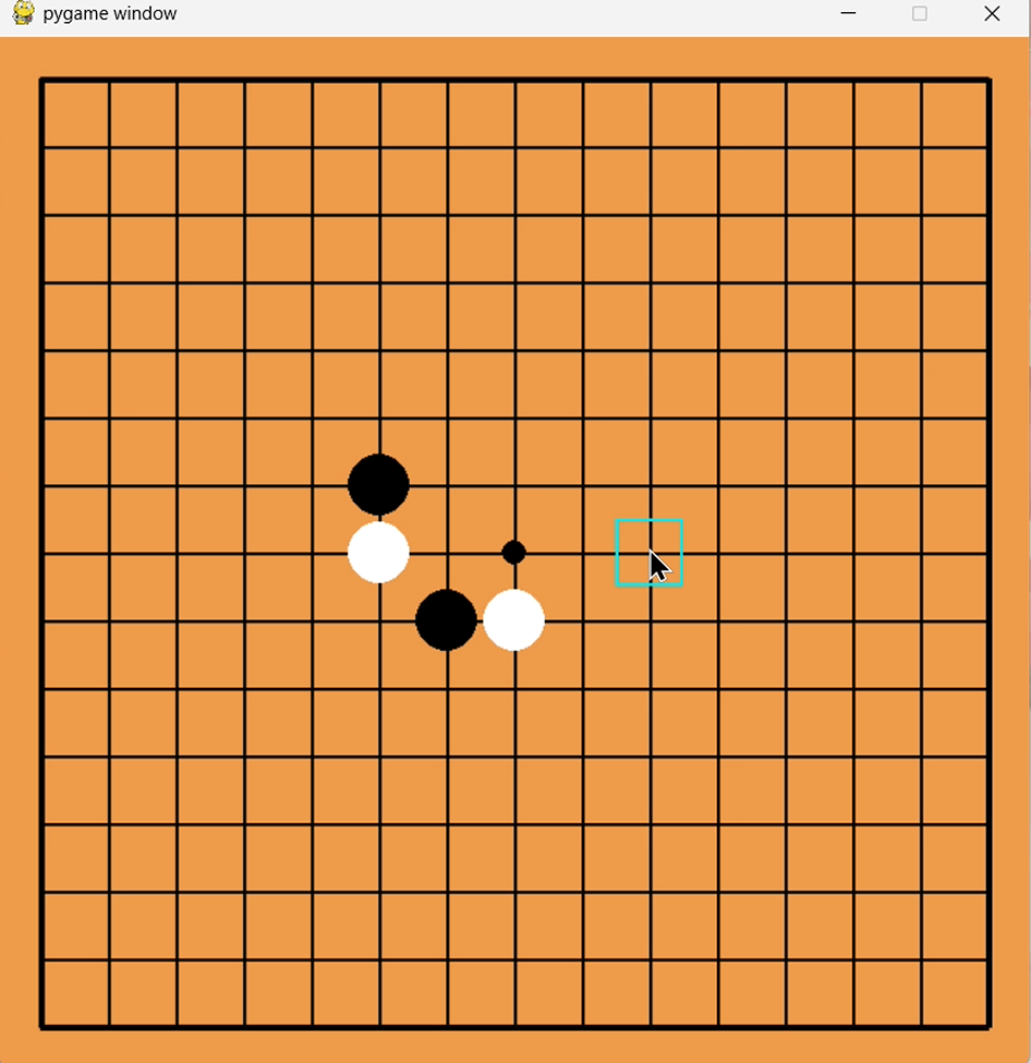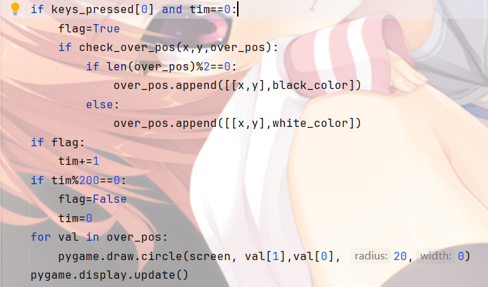 同时,五子棋为黑白交替落子,因此我使用len(over_pos)%2函数,判断当前棋盘状态中已经落子的数量是否为偶数,若为偶数,则黑棋落子,若为奇数,白棋落子。最后,显示所有落下的棋子,刷新显示。