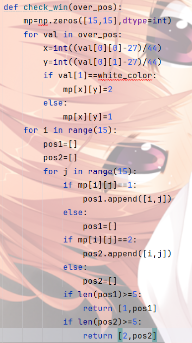 落子之后,需要判断五子连珠。首先,初始化棋盘矩阵,mp=np.zeros([15,15],dtype=int),创建一个15×15的二维数组mp,表示棋盘,棋盘的每个位置初始值为0,表示空格,黑子用1表示,白子用2表示。其次,将over_pos的坐标映射到棋盘数组,通过公式x=int((val[0][0]-27)/44)和y=int((val[0][1]-27)/44) 将实际坐标映射到棋盘数组的索引,根据棋子颜色赋值到mp中。之后通过四种方式判断有无五子连珠,即水平、垂直、主对角线、副对角线,原理是类似的,遍历棋盘的每一行(列)(对角线),检查是否存在连续的五个黑子或白子,如果找到五子连珠,则返回胜利方的编号(1表示黑子胜利,2表示白子胜利)以及连珠的坐标列表。如果没有五子连珠,返回[0, []]表示没有玩家获胜。