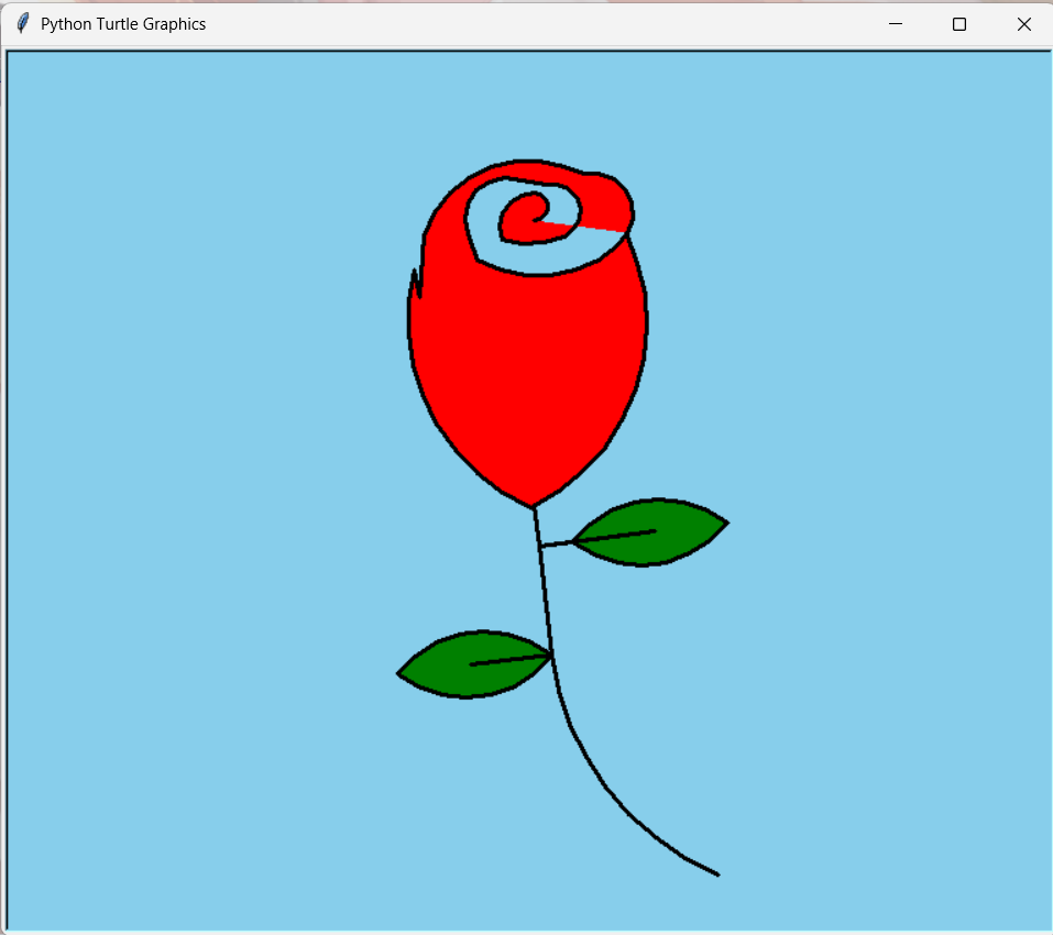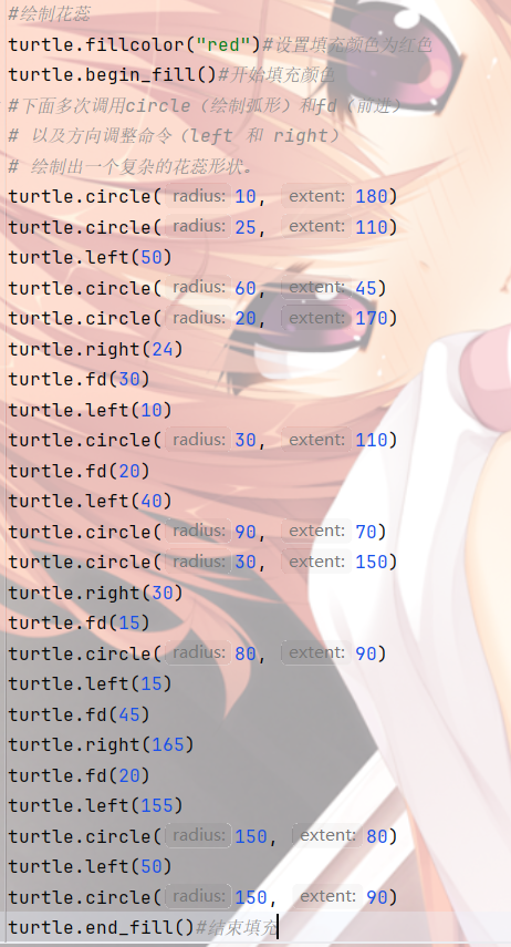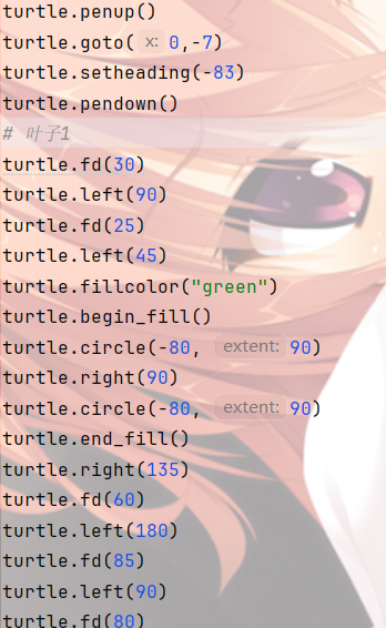 绘制花蕊之后,我想绘制叶子,但是此时海龟的位置并不在我想要他在的位置,于是,我使用turtle.goto(0,-7),使之到达相应的位置,但是如果直接过去,会产生痕迹,于是,我使用了turtle.penup()以及turtle.pendown(),使之没有痕迹,此外,我使用turtle.setheading(-83),调整海龟的头部方向。