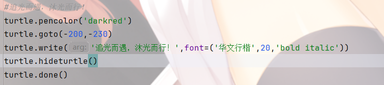 turtle.write('追光而遇,沐光而行!',font=('华文行楷',20,'bold italic'))#输出文字