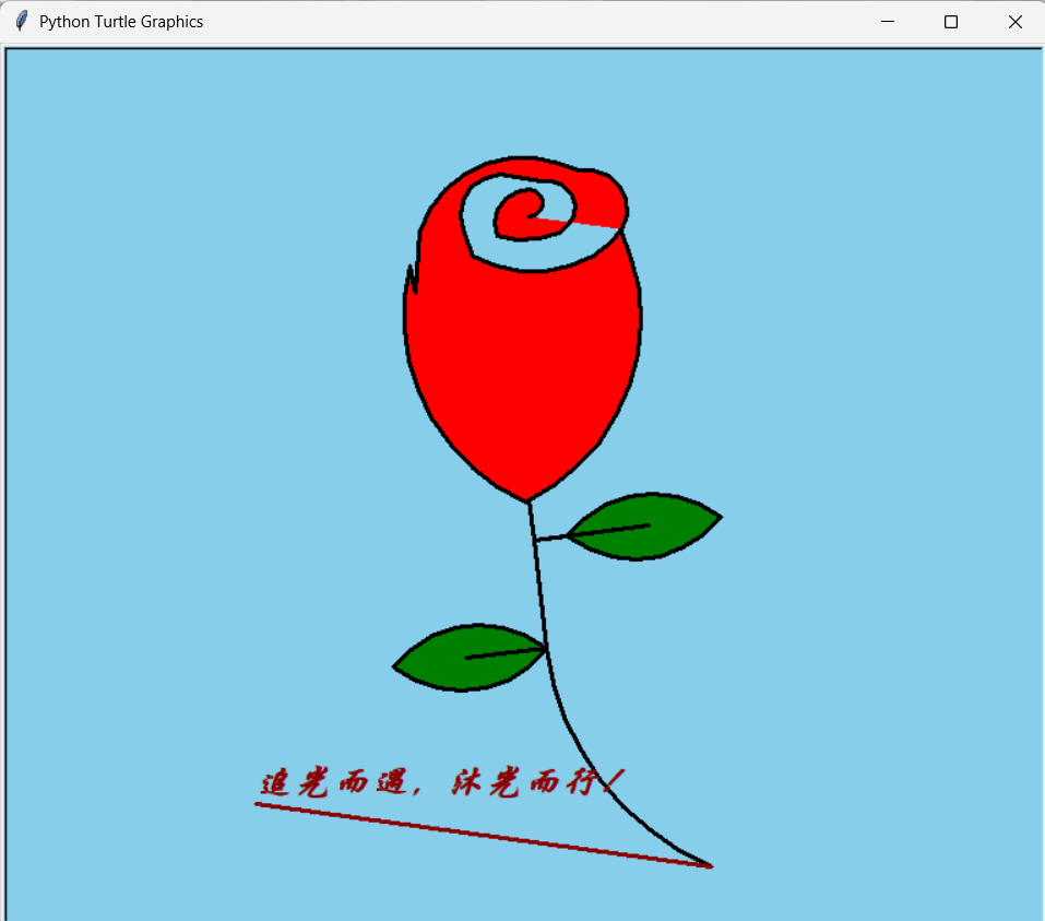 ②海龟绘图设计。绘制一朵花,附有文字“追光而遇、沐光而行!”尽量使得花居于中间位置,体现位置上的美感。充分利用偏移角度、前往、抬笔落笔等,确保美观性。设计合适的速度,使得绘画过程得以完全展现。
