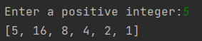 1 def collatz(n): 2 lst = [n] 3 while lst[-1] != 1: 4 if lst[-1] % 2 == 0: 5 lst.append(lst[-1]//2) 6 else: 7 lst.append(lst[-1]*3+1) 8 return lst 9 10 11 try: 12 n = int(input('Enter a positive integer:')) 13 if n <= 0: 14 raise 15 except: 16 print('Error: must be a positive integer') 17 else: 18 print(collatz(n))