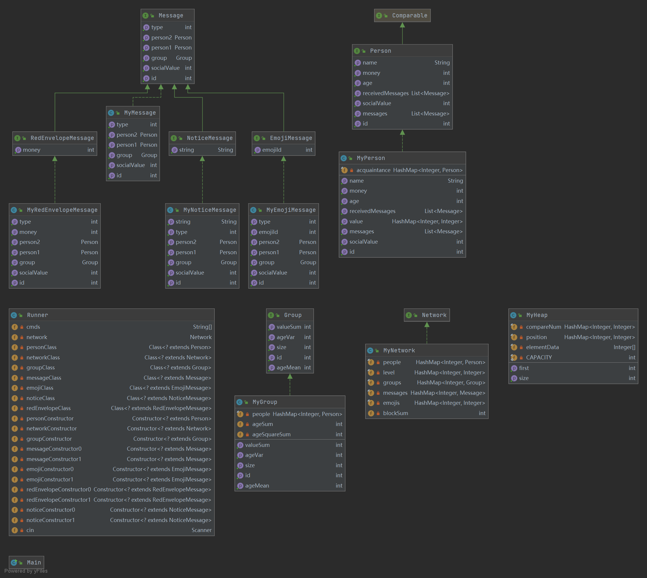 关于MyPerson类,有属性id, name, age, socialValue, money,还有用来存储与其有连接的人acquaintance, 和相应权值value,以及用来存储接收信件的容器messages。并且根据jml对其进行改变、维护。