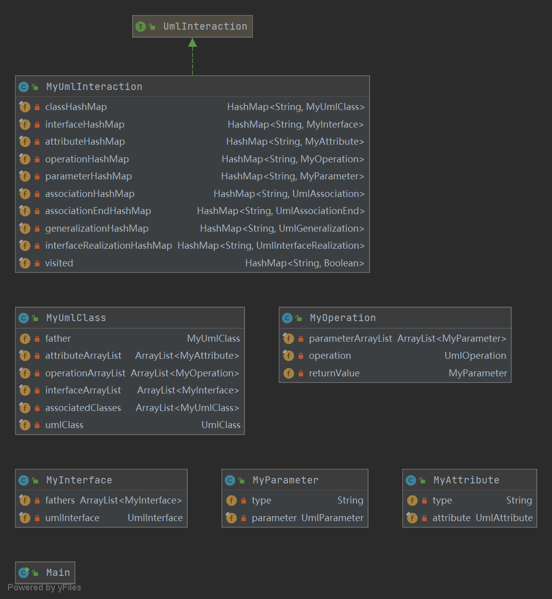 在总的大类MyUmlInteraction中,我用各种Hashmap容器来存储各种各样的元素,具体代码如图所示:
