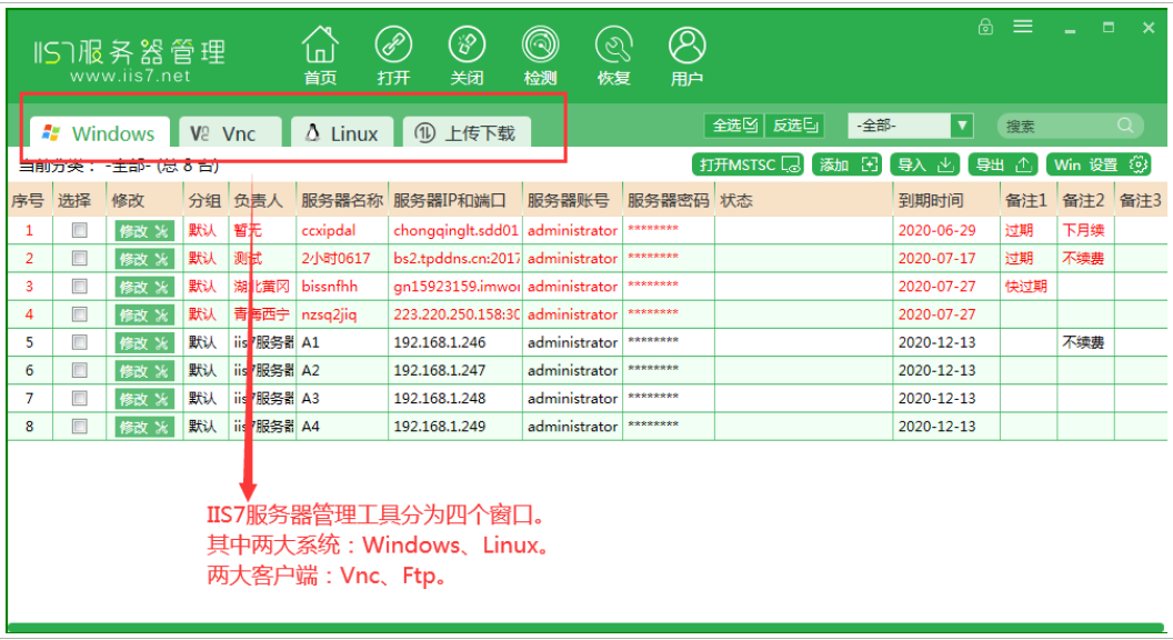 IIS7服务器管理工具的VNC功能可以说是使用起来十分方便。它可以一键导出或导入,一键批量打开VNC,一键批量关闭VNC,服务器到期提醒,支持多台VNC 自定义备注,自定义分组,支持批量操作。