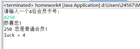 public class Exe4_1_2 { //2.输入一个4位会员卡号,如果百位数字是随机数,就输出是幸运会员,否则就输出不是. public static void main(String[] args) { Scanner input = new Scanner(System.in); Random r = new Random(); int luck = r.nextInt(10); System.out.println("请输入一个4位会员卡号:"); int id = input.nextInt(); System.out.println("恭喜您!"); if (id%10/10==luck) { System.out.println(id + " 您是幸运会员!"); } else { System.out.println(id + " 您是普通会员!"); } System.out.print("luck = "+luck); } }