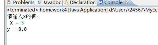 import java.util.Scanner; public class Exe4_1_3 { /*已知函数,输入x的值,输出对应的y的值. x + 3 ( x > 0 ) y = 0 ( x = 0 ) x*2 –1 ( x < 0 )*/ public static void main(String[] args) { Scanner input = new Scanner(System.in); System.out.print("请输入X的值:\n X = "); double x = input.nextDouble(); double y ; if (x > 0) { y = x+3; }else if (x < 0) { y = x*2-1; } else { y = 0; } System.out.println("y = " + y); } }