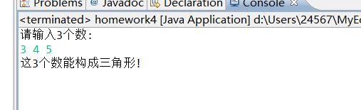import java.util.Scanner; public class Exe4_1_4 { //4.输入三个数,判断能否构成三角形(任意两边之和大于第三边) public static void main(String[] args) { Scanner input = new Scanner(System.in); System.out.println("请输入3个数:"); int a = input.nextInt(); int b = input.nextInt(); int c = input.nextInt(); if (a+b>c&&a+c>b&&b+c>a) { System.out.println("这3个数能构成三角形!"); } else { System.out.println("这3个数不能构成三角形"); } } }