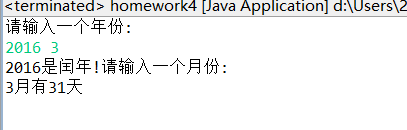 import java.util.Scanner; public class Exe4_2_1 { // 1 输入年份月份,输出该月的天数(闰年2月29天,条件参考上机练习1) public static void main(String[] args) { Scanner input = new Scanner(System.in); System.out.println("请输入一个年份:"); int year = input.nextInt(); int er = 0; if (year%4==0 && year%100!=0||year%400==0) { System.out.print(year + "是闰年!"); er = 1; } else { System.out.print(year + "不是闰年!"); er = 0; } System.out.println("请输入一个月份:"); int month = input.nextInt(); switch (month) { case 1:case 3:case 5: case 7:case 8:case 10:case 12: System.out.println(month + "月有31天"); break; case 4:case 6:case 9:case 11: System.out.println(month + "月有30天"); break; case 2: if (er==1) { System.out.println(month + "月有29天"); } else { System.out.println(month + "月有29天"); } break; default: System.out.println("您输入的月份有误,请输入1~12!"); break; } } }