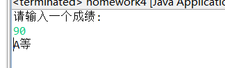 import java.util.Scanner; public class Exe4_2_2 { // 给定一个成绩a,使用switch结构求出a的等级。 // A:90-100,B:80-89,C:70-79,D:60-69,E:0~59 public static void main(String[] args) { Scanner input = new Scanner(System.in); System.out.println("请输入一个成绩:"); int grade = input.nextInt(); switch (grade/10) { case 9:case 10: System.out.println("A等"); break; case 8: System.out.println("B等"); break; case 7: System.out.println("C等"); break; case 6: System.out.println("D等"); break; case 5:case 4:case 3: case 2:case 1:case 0: System.out.println("E等"); break; default: System.out.println("您的输入不正确!"); break; } } }
