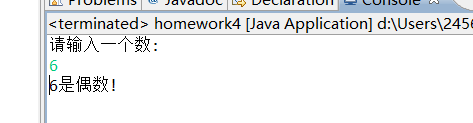 import java.util.Scanner; public class Exe4_2_3 { // 输入一个数字,判断是一个奇数还是偶数 public static void main(String[] args) { Scanner input = new Scanner(System.in); System.out.println("请输入一个数:"); int num = input.nextInt(); if (num==0) { System.out.println(num + "既不是奇数,也不是偶数!"); } else if (num%2==0){ System.out.println(num + "是偶数!"); } else { System.out.println(num + "是奇数!"); } } }