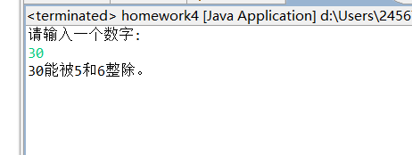 import java.util.Scanner; public class Exe4_2_5 { /* 判断一个数字是否能被5和6同时整除(打印能被5和6整除), 或只能被5整除(打印能被5整除 ),或只能被6整除,(打印能被6整除), 不能被5或6整除,(打印不能被5或6整除)*/ public static void main(String[] args) { Scanner input = new Scanner(System.in); System.out.println("请输入一个数字:"); int num = input.nextInt(); if (num%30==0) { System.out.println(num + "能被5和6整除。"); } else if (num%6==0){ System.out.println(num + "只能被6整除。"); } else { System.out.println(num + "只能被5整除。"); } }