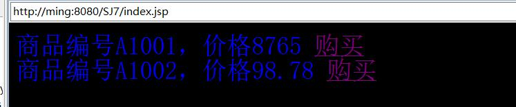 <%@ page language="java" import="java.util.*" pageEncoding="utf-8"%> <!DOCTYPE HTML PUBLIC "-//W3C//DTD HTML 4.01 Transitional//EN"> <html> <head> <title>My JSP 'index.jsp' starting page</title> </head> <body bgcolor = #000000> <% double price=98.78; %> <p style = "font-family:宋体;font-size:36;color:blue"> 商品编号A1001,价格8765 <a href="id.jsp?id=A1001&price=8765">购买</a><br> 商品编号A1002,价格<%=price %> <a href="id.jsp?id=A1002&price=<%=price %>">购买</a><br> </p> </body> </html> <%@ page language="java" import="java.util.*" pageEncoding="utf-8"%> <!DOCTYPE HTML PUBLIC "-//W3C//DTD HTML 4.01 Transitional//EN"> <html> <head> <title>My JSP 'index.jsp' starting page</title> </head> <body bgcolor = #EEEEFF> <p style = "font-family:宋体;font-size:36;color:blue"> <% String id=request.getParameter("id"); String price=request.getParameter("price"); %> <b>商品编号:<%=id %><br> 商品价格:<%=price %></b> </p> </body> </html>