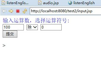 input.jsp: <html> <head> <%@ page language="java" import="java.util.*" pageEncoding="utf-8"%> <meta http-equiv="Content-Type" content="text/html; charset=ISO-8859-1"> <title>???????</title> </head> <body> <form action="computer.jsp" method=post name=form> <p style="font-family:宋体;font-size:18;color:blue"> 输入运算数,选择运算符号:<br> <input type=text name="numberOne" size=6/> <select name="operator"> <option selected="selected" value="+">加 <option value="-">减 <option value="*">乘 <option value="/">除 </select> <input type=text name="numberTwo"size=6/> <br><input type="submit" name="submit" value="提交"/> </form>> </body> </html> computer.jsp: <!DOCTYPE HTML PUBLIC "-//W3C//DTD HTML 4.01 Transitional//EN"> <html> <head> <%@ page language="java" import="java.util.*" pageEncoding="utf-8"%> <meta http-equiv="Content-Type" content="text/html; charset=ISO-8859-1"> <title>???????</title> </head> <body> <p style="font-family=宋体;font-size:18;color:black"> <% String numberOne=request.getParameter("numberOne"); String numberTwo=request.getParameter("numberTwo"); String operator=request.getParameter("operator"); if(numberOne == null||numberOne.length()==0){ response.sendRedirect("input.jsp"); return; } else if(numberTwo ==null||numberTwo.length()==0){ response.sendRedirect("input.jsp"); return; } try{ double a=Double.parseDouble(numberOne); double b=Double.parseDouble(numberTwo); double r=0; if(operator.equals("+")) r=a+b; else if(operator.equals("-")) r=a-b; else if(operator.equals("*")) r=a*b; else if(operator.equals("/")) r=a/b; out.print(a+""+operator+""+b+"="+r); } catch(Exception e){ out.println("请输入字符"); } %> </body> </html>