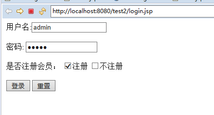 login.jsp: <%@ page language="java" import="java.util.*" pageEncoding="utf-8"%> <html> <head> <title>登录页面</title> </head> <body> <script type="text/javascript"> function validate(){ if(loginForm.uname.value==""){ alert("账号不能为空!"); return; } if(loginForm.upwd.value==""){ alert("密码不能为空!"); return; } loginForm.submit(); } </script> <form name="loginForm" action="dologin.jsp" method="post"> 用户名:<input type="text" name="uname" ><br> <br>密码: <input type="password" name="upwd" ><br> <br> 是否注册会员: <input type="checkbox" name="yes" value="1"/>注册 <input type="checkbox" name="yes" value="2"/>不注册<br> <br><input type="button" value="登录" onClick="validate()"> <input type="reset" value="重置"> </form> </body> </html> ok.jsp: <!DOCTYPE HTML PUBLIC "-//W3C//DTD HTML 4.01 Transitional//EN"> <html> <head> <%@ page language="java" import="java.util.*" pageEncoding="utf-8"%> <meta http-equiv="Content-Type" content="text/html; charset=ISO-8859-1"> <title>登录成功页面</title> </head> <body> <h1>登陆成功!!</h1> <% String []yes=request.getParameterValues("yes"); for(int i=0;i<yes.length;i++){ if(yes[i].equals("1")){ out.print("注册为会员"); } } %> </body> </html>