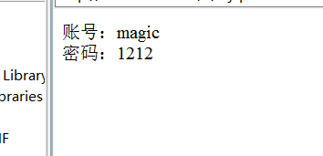 <%@ page language="java" import="java.util.*" pageEncoding="utf-8"%> <!DOCTYPE HTML PUBLIC "-//W3C//DTD HTML 4.01 Transitional//EN"> <html> <head> </head> <body> <form action="J.jsp"> <input type="text" name="id" value="magic"/><br> <input type="password" name="password" value="magic"/><br> <input type="submit" value="登录"/> </form> </body> </html> <%@ page language="java" import="java.util.*" pageEncoding="utf-8"%> <!DOCTYPE HTML PUBLIC "-//W3C//DTD HTML 4.01 Transitional//EN"> <html> <head> </head> <% String id=request.getParameter("id"); String password=request.getParameter("password"); if(id.equals(password)){ request.getRequestDispatcher("q.jsp").forward(request, response); }else{ response.sendRedirect("m.jsp"); } %> <body> </body> </html> <%@ page language="java" import="java.util.*" pageEncoding="utf-8"%> <!DOCTYPE HTML PUBLIC "-//W3C//DTD HTML 4.01 Transitional//EN"> <html> <head> </head> <body> 登录失败! </body> </html> <%@ page language="java" import="java.util.*" pageEncoding="utf-8"%> <!DOCTYPE HTML PUBLIC "-//W3C//DTD HTML 4.01 Transitional//EN"> <html> <head> </head> <%String src=request.getParameter("id"); %> <body> 登录成功!<br> <form action="n.jsp"> 姓名<input type="text" name="name"/><br> <input type="submit" value="提交"/> <input type="hidden" name="src" value="<%= src %>"/> </form> </body> </html> <%@ page language="java" import="java.util.*" pageEncoding="utf-8"%> <!DOCTYPE HTML PUBLIC "-//W3C//DTD HTML 4.01 Transitional//EN"> <html> <head> </head> <body> <%String src=request.getParameter("src"); String name=request.getParameter("name"); %> 账号:<%=src %><br> 密码:<%=name %> </body> </html>