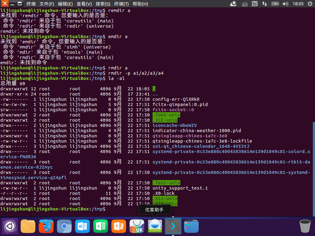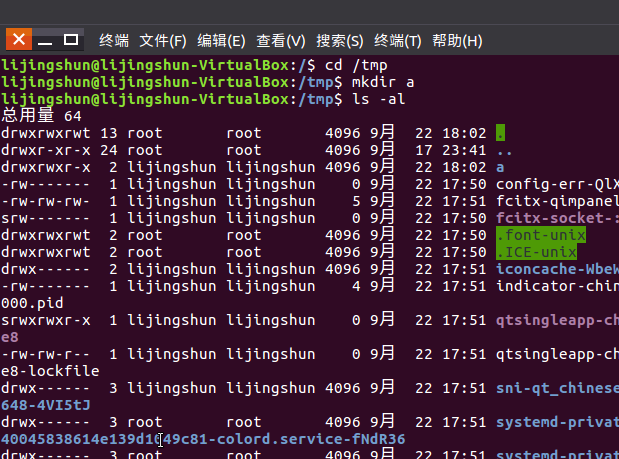 (5)进入/tmp目录,创建一个名为a的目录,并查看有多少目录