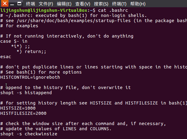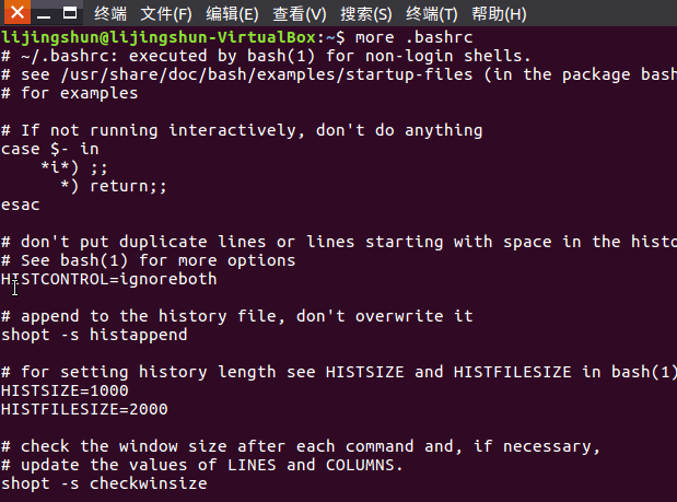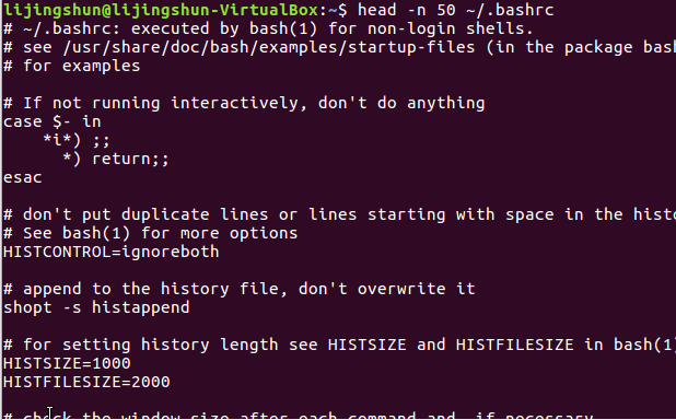 (19)查看主文件夹下.bashrc文件内容,后面50行不显示,只显示前面几行