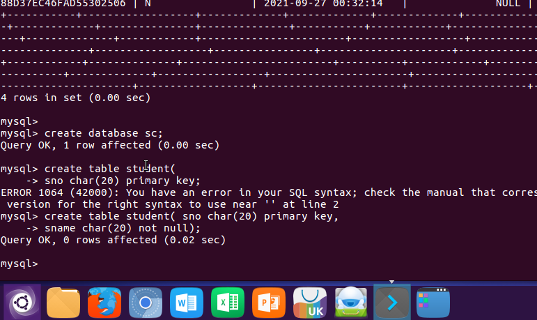 (32)在sc中创建一个表格:create table if not exists student( );