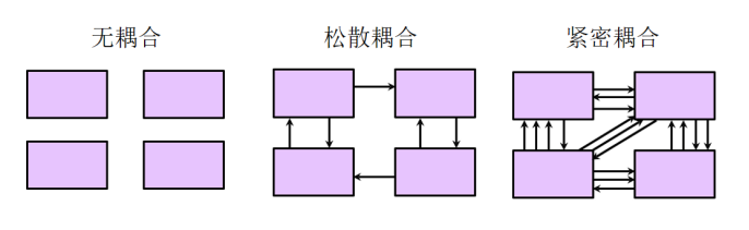 软件设计中的模块化程度便成为了软件设计有多好的一个重要指标,一般我们使用耦合度(Coupling)和内聚度(Cohesion)来衡量软件模块化的程度。耦合度是指软件模块之间的依赖程度,一般可以分为紧密耦合(Tightly Coupled)、松散耦合(Loosely Coupled)和无耦合(Uncoupled)。一般在软件设计中我们追求松散耦合。内聚度是指一个软件模块内部各种元素之间互相依赖的紧密程度。理想的内聚是功能内聚,也就是一个软件模块只做一件事,只完成一个主要功能点或者一个软件特性(Feather)。