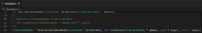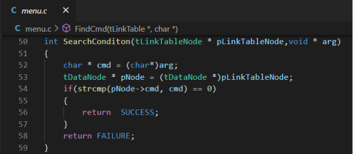 在menu.c中,我们可以看到这个可重用接口的具体使用。menu.c中先定义了一个SearchCondition函数,用来定义查找链表的条件,然后FindCmd函数调用了SearchLinkTableNode函数接口,而且将SearchCondition函数作为参数传入这个接口。