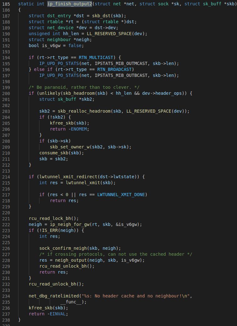 4.接下来就用 ip_finish_ouput2 设置链路层报文头了。如果,链路层报头缓存有(即hh不为空),那就拷贝到skb里。如果没,那么就调用neigh_resolve_output,使用 ARP 获取。