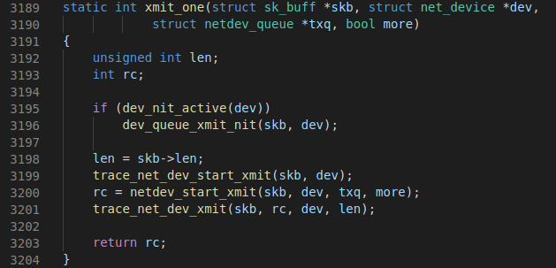 2.在xmit_one中调用__net_dev_start_xmit函数。进而调用netdev_start_xmit,实际上是调用__netdev_start_xmit函数。