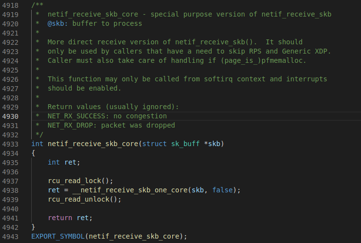 2.然后发出一个软中断(NET_RX_SOFTIRQ,该变量定义在include/linux/interrupt.h 文件中),通知内核接收到新的数据帧。进入软中断处理流程,调用 net_rx_action 函数。包从 rx_ring 中被删除,进入 netif _receive_skb 处理流程。