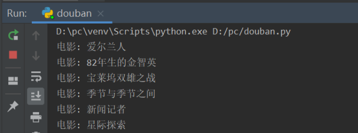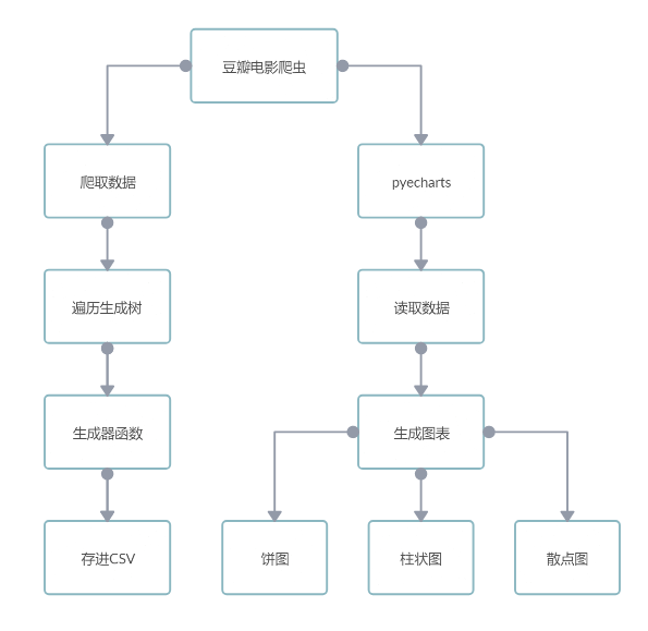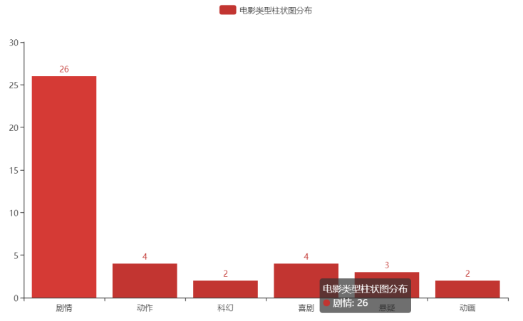 该项目爬取的数据生成CSV文件,对表中的数据进行分析。绘制成的饼图可以看出各个地区生产数的多少;绘制成的柱状图可以看出各个电影类型数量的多少;绘制成的散点图可以看出电影评分的高低,在网页上移动到某一散点,可以看到该散点对应的电影名称。