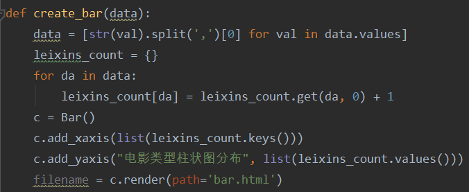 (2)通过传入data这个数据,使用pycharts把数据生成电影类型柱状图,并渲染到bar.html