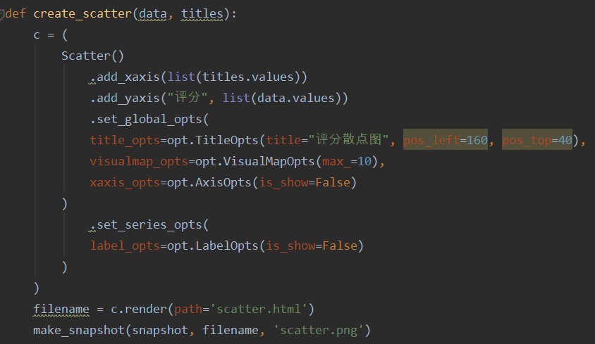 (3)通过传入data和titles这两个数据,使用pycharts把数据生成电影评分散点图,并渲染到scatter.html