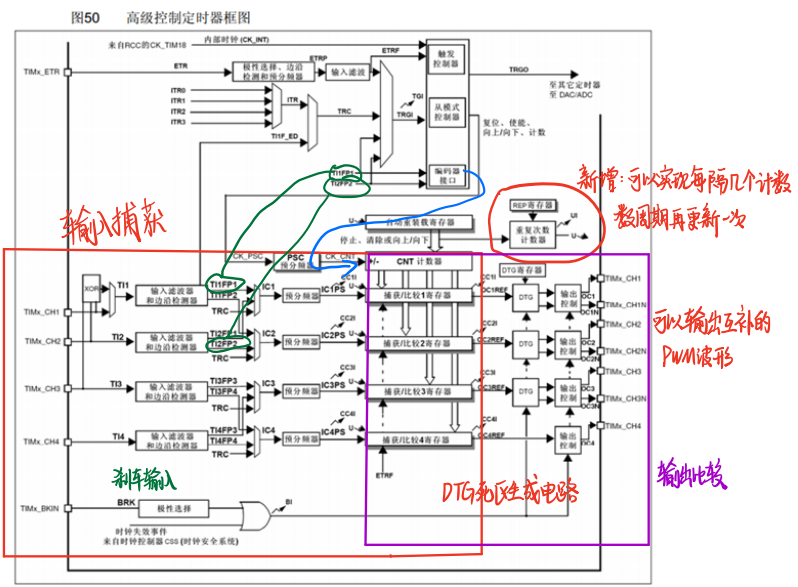 左边这一块是输入捕获电路,总共有四个通道,分别对应CH1到CH4的引脚,可以用于测输入方波的频率等