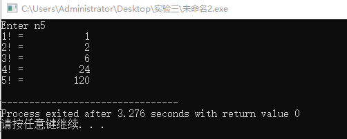 #include<stdio.h> long long fac(int n); int main(){ int i, n; printf("Enter n"); scanf("%d",&n); for(i = 1;i <= n;++i) printf("%d! = %11d\n",i,fac(i)); return 0; } long long fac(int n){ static long long p = 1; p = p * n; return p; }