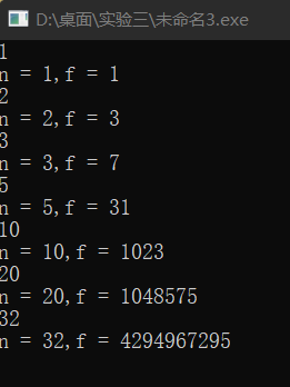 #include <stdio.h> long long func(int n); int main(){ int n; long long f; while(scanf("%d",&n) != EOF){ f = func(n); printf("n = %d,f = %lld\n",n,f); } return 0; } long long func(int n) { long long a,b; if(n == 0) { a = 0; }else{ b = 2*func(n-1)+1; a = b; } return a; }