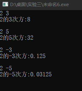 #include <stdio.h> double mypow(int x,int y); int main(){ int x, y; double ans; while(scanf("%d%d",&x,&y)!=EOF){ ans=mypow(x,y); printf("%d的%d次方:%g\n\n",x,y,ans); } return 0; } double mypow(int x,int y){ double s=1; while(y>0){ s=s*x; y=y-1; } while(y<0){ s=s/x; y=y+1; } return s; }