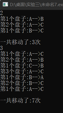 #include<stdio.h> #include<math.h> void hanoi(unsigned int n,char from,char temp,char to);//递归函数声明 void moveplate(unsigned int n,char from,char to); int main() { unsigned int n,i; while(scanf("%u",&n) != EOF) { hanoi(n,'A','B','C'); i=pow(2,n)-1; printf("\n一共移动了:%d次\n",i); } return 0; } void hanoi(unsigned int n,char from,char temp,char to) { if(n==1) moveplate(n,from,to); else { hanoi(n-1,from,to,temp); moveplate(n,from,to); hanoi(n-1,temp,from,to); } } void moveplate(unsigned int n,char from,char to) { printf("第%u个盘子:%c-->%c\n",n,from,to); }