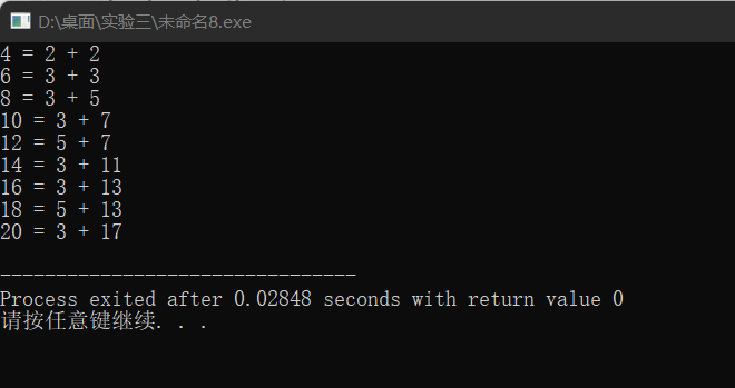 #include <stdio.h> #include <math.h> int is_prime(int n); int main() { int i, k, a[15], j = 0, l; for (k = 2; k <= 20; k++) { if (is_prime(k)) a[j++] = k; } for (i = 2; i <= 10; i++) { for (l = 1; l <= 10; l++) { if (is_prime(2 * i - a[l - 1])) { printf("%d = %d + %d\n", (2 * i), a[l - 1], (2 * i - a[l - 1])); break; } } } return 0; } int is_prime(int n) { int i, flag = 1; for (i = 2; i <= sqrt(n); i++) { if (n % i == 0) { flag = 0; break; } } return flag; }