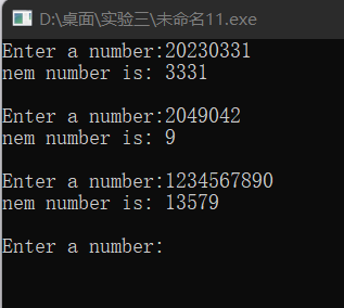 #include<stdio.h> #include<math.h> long func(long s); int main(){ long s,t; printf("Enter a number:"); while(scanf("%ld",&s)!=EOF){ t=func(s); printf("nem number is: %ld\n\n",t); printf("Enter a number:"); } return 0; } long func(long s){ long b=0,t=0; int a,m; while(s!=0){ a=s%10; if(a%2!=0) b=10*b+a; s=s/10; } while(b!=0){ m=b%10; t=10*t+m; b=b/10; } return t; }