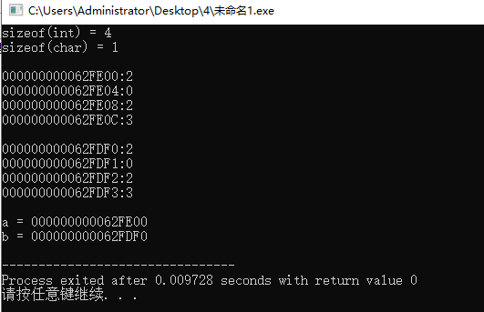 #include<stdio.h> #define N 4 int main(){ int a[N] = {2,0,2,3}; char b[N] = {'2','0','2','3'}; int i; printf("sizeof(int) = %d\n",sizeof(int)); printf("sizeof(char) = %d\n",sizeof(char)); printf("\n"); for (i = 0;i < N;++i) printf("%p:%d\n",&a[i],a[i]); printf("\n"); for (i = 0;i < N;++i) printf("%p:%c\n",&b[i],b[i]); printf("\n"); printf("a = %p\n",a); printf("b = %p\n",b); return 0; }