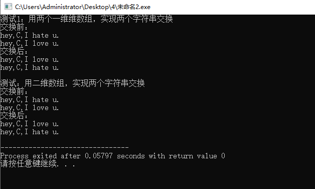#include<stdio.h> #include<string.h> #define N 80 void swap_str(char s1[N],char s2[N]); void test1(); void test2(); int main(){ printf("测试1:用两个一维维数组,实现两个字符串交换\n"); test1(); printf("\n测试:用二维数组,实现两个字符串交换\n"); test2(); return 0; } void test1(){ char views1[N] = "hey,C,I hate u."; char views2[N] = "hey,C,I love u."; printf("交换前:\n"); puts(views1); puts(views2); swap_str(views1,views2); printf("交换后:\n"); puts(views1); puts(views2); } void test2(){ char views[2][N] ={"hey,C,I hate u.", "hey,C,I love u."} ; printf("交换前:\n"); puts(views[0]); puts(views[1]); swap_str(views[0],views[1]); printf("交换后:\n"); puts(views[0]); puts(views[1]); } void swap_str(char s1[N],char s2[N]){ char tmp[N]; strcpy(tmp,s1); strcpy(s1,s2); strcpy(s2,tmp); }