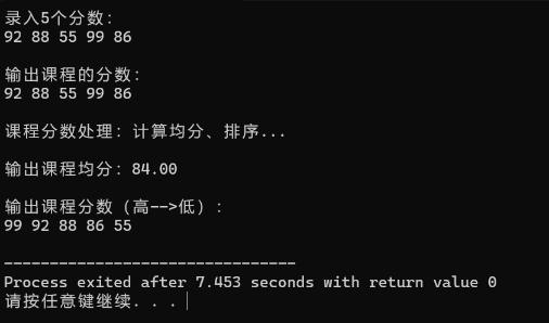 #include<stdio.h> #define N 5 void input(int x[], int n); void output(int x[], int n); double average(int x[], int n); void bubble_sort(int x[], int n); int main(){ int scores[N]; double ave; printf("录入%d个分数:\n", N); input(scores, N); printf("\n输出课程的分数:\n"); output(scores, N); printf("\n课程分数处理:计算均分、排序...\n"); ave=average(scores, N); bubble_sort(scores, N); printf("\n输出课程均分:%.2f\n",ave); printf("\n输出课程分数(高-->低):\n"); output(scores, N); return 0; } //保存 void input(int x[], int n){ int i; for(i = 0; i < n; ++i) scanf("%d", &x[i]); } //输出 void output(int x[], int n){ int i; for(i = 0; i < n; ++i) printf("%d ", x[i]); printf("\n"); } //平均 double average(int x[], int n){ int i; int sum=0; double ave; for(i = 0;i < n; i++){ sum=sum+x[i]; } ave=sum/n; return ave; } //排序 void bubble_sort(int x[], int n){ int i,t,j; for(i = 0; i < n ; i++){ for(j = i; j < n; j++) if(x[i] < x[j+1]){ t = x[i]; x[i] = x[j+1]; x[j+1] = t; } } }
